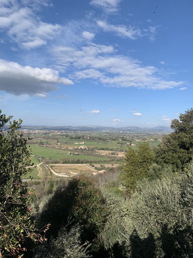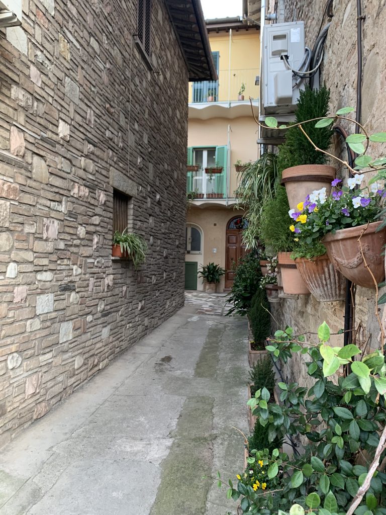 Although I loved the entire trip, Assisi has a special place in my heart. I suspect which location you love depends very much upon your inner personality and if you like urban or rural settings. The minute we drove into the area, I was in love. Lots of rolling hills and farmland dot the edges of town. Our hotel was down from a little cathedral. Our tour guide mentioned we could walk to it, see picturesque Italian alleyways and go inside for mass.